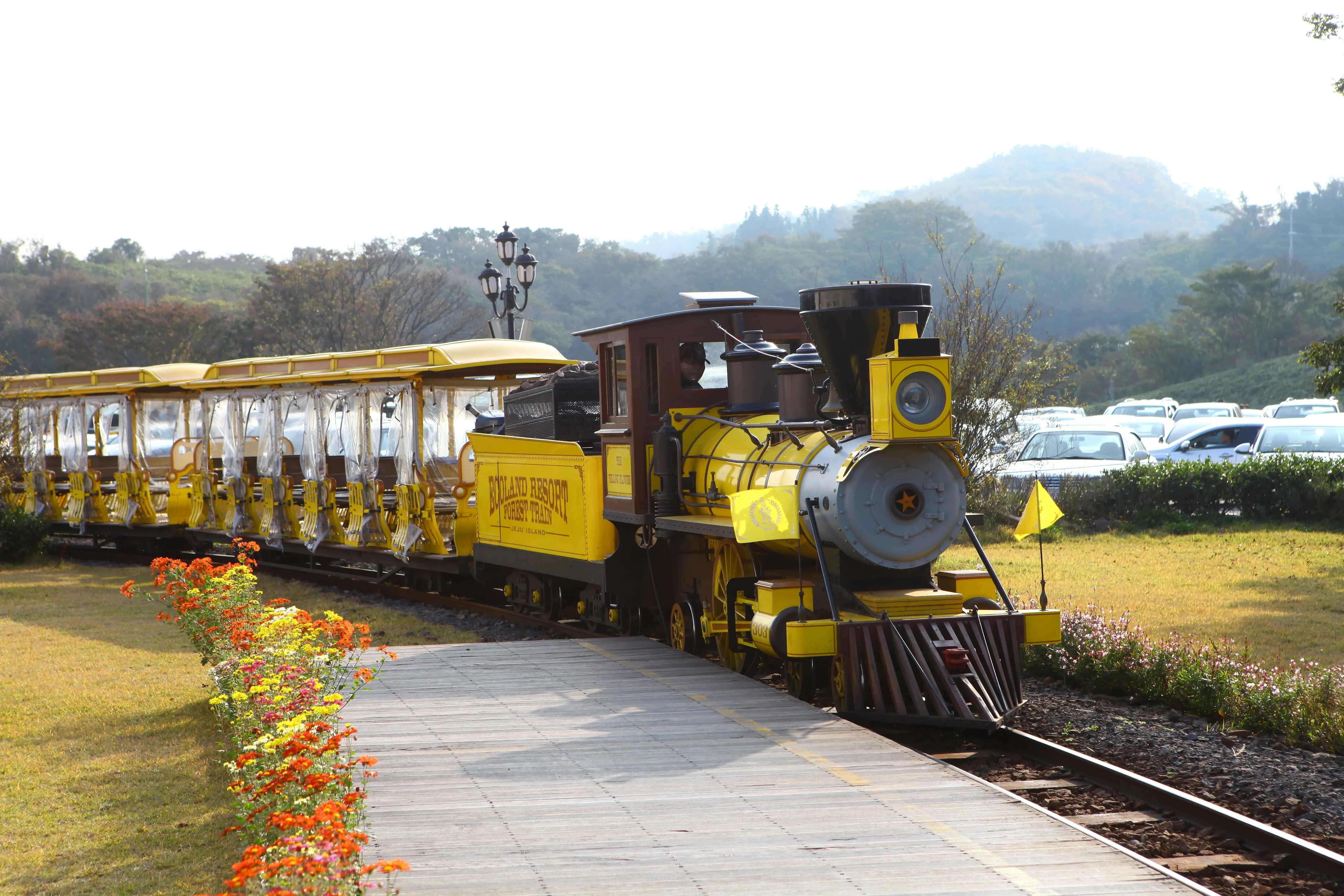 A charming forest theme park where a vintage-style train takes you through Jeju’s natural landscapes.