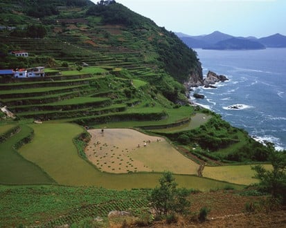 남해 가천 다랭이마을의 계단식 논과 바다 풍경 감상